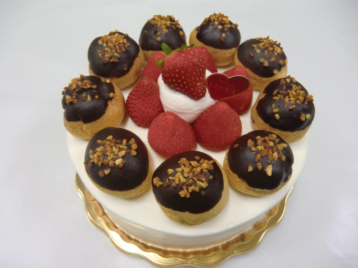 デコレーションケーキの上にチョコをかけたプチシューを乗せました。