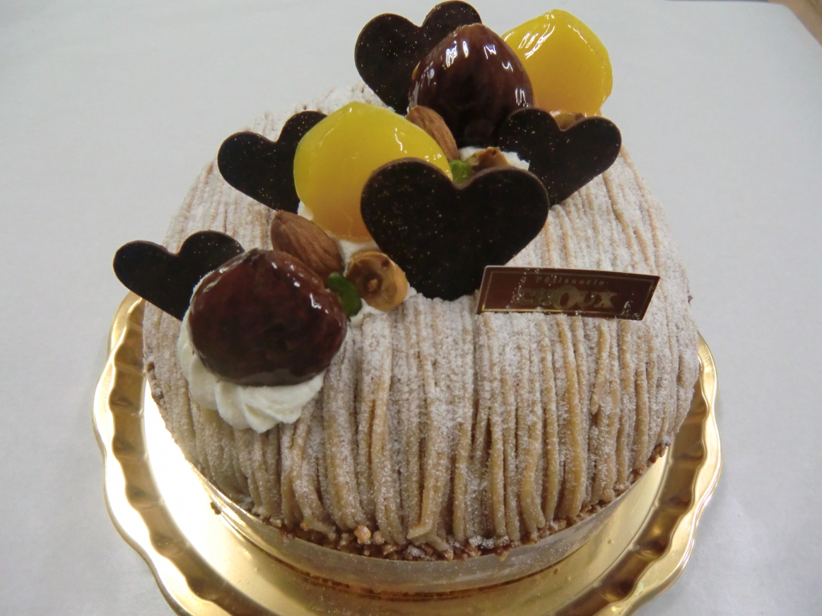 コーヒー風味のアーモンド生地の中に、ショコラのムースとマロンのムースを合わせて、マロングラサージュで仕上げました